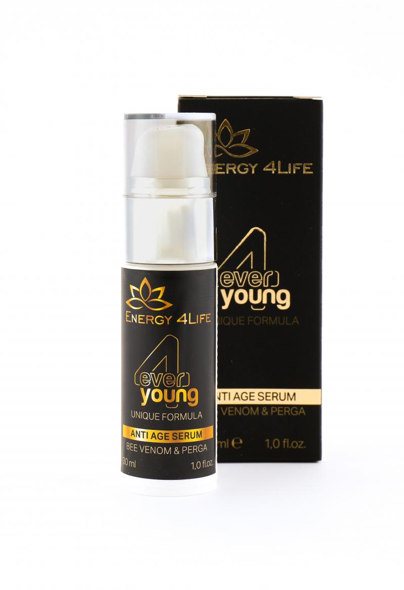 PERGA (matične ćelije lekovitog bilja) – Karakteriše je sadržaj esencijalnih aminokiselina, kompleks vitamina i minerala kao i bioloških aktivnih materija koji hrane i štite kožu od preranog starenja i pojave bora, povećavaju njen tonus, koži daju svežiji izgled čineći je glatkom i mekom, ublažavaju upalne procese, štite od slobodnih radikala, sprečavaju nastanak staračkih pega. Ima izuzetna kozmetička svojstva jer se odlikuje izvanrednom prolaznošću kroz kožu te na taj način hrani mišićne slojeve glikogenom što direktno usporava starenje kože. Dejstvo seruma 4EVER YOUNG na kožu: Lagana i prijatna tekstura seruma sa izuzetnim lifting svojstvima, čini kožu čvrstom, glatkom, ujednačenom i mekom. Implementirana moć aktivnih supstanci iz BEEVENOM- a i PERGE sačuvana je u 4EVER YOUNG anti-age serumu u cilju stimulacije ćelijskog metabolizma i očuvanja dugovečnosti kože. Jedinstvena prirodna zamena za botoks, njegovo blagotvorno delovanje “obmanjuje” kožu, zbog čega krv kreće u tretirano područje. Na taj način deluje na korigovanje mimičnih bora. Regeneriše površinski sloj epiderma, poboljšava cirkulaciju i zateže kožu.